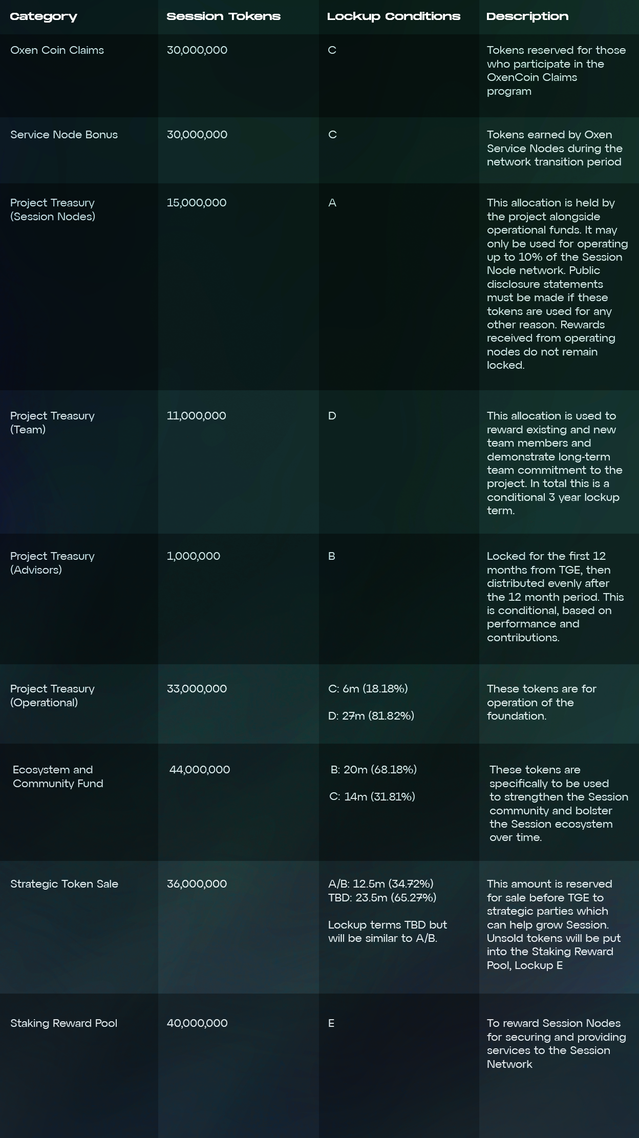 - This chart assumes all currently sold Session tokens will participate in lockup B, in reality strategic parties can choose between lockup A and B before TGE. This chart will be updated once strategic parties decide on their lockup conditions.